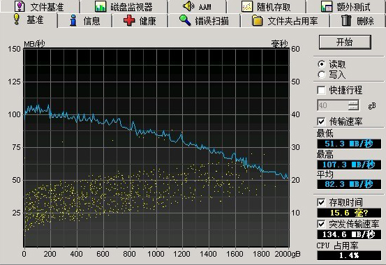 吞吐量主要指大文件的连续读写速度,在大文件的复制、备份等场景适用,用“HD Tune专业版”中的“基准”测试功能即可测试出磁盘的吞吐量,一般传统机械sata硬盘的顺序读写速度为 :80~150M/s, SAS硬盘为150~200M/s,SSD固态硬盘为400~600M/s。