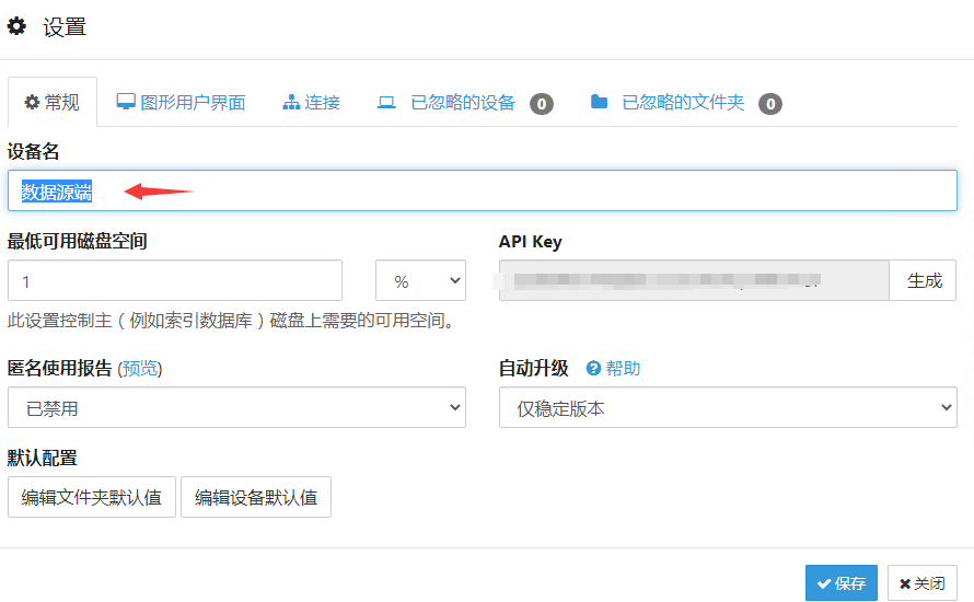 同步备份端设置同步接收目录: 在备份端Syncthing点击右上角“操作”-- “设置”-- “编辑文件夹默认值”,添加设置一个默认的接收保存目录。
