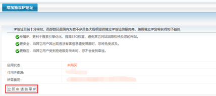 进入虚拟主机管理页面,点击“增加独立IP”后进入购买页面;